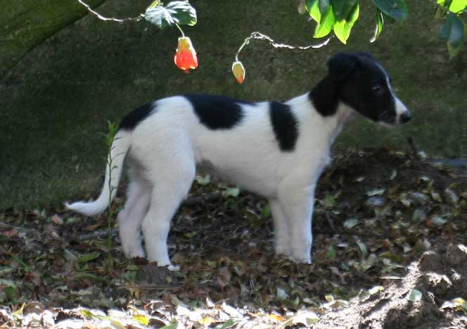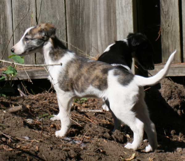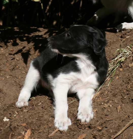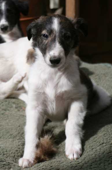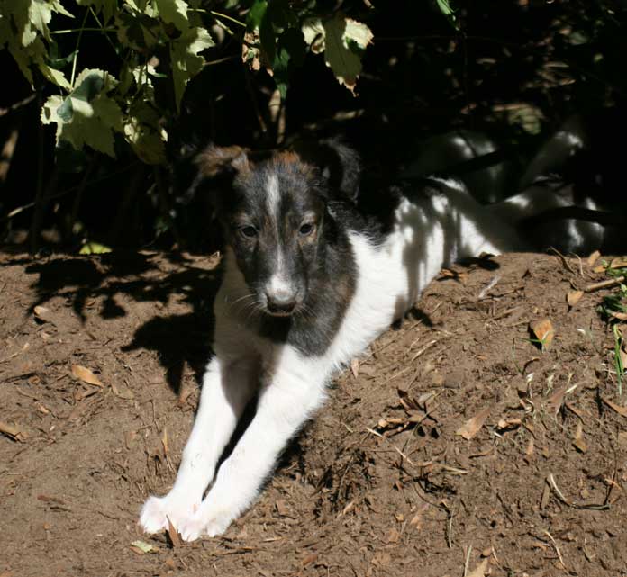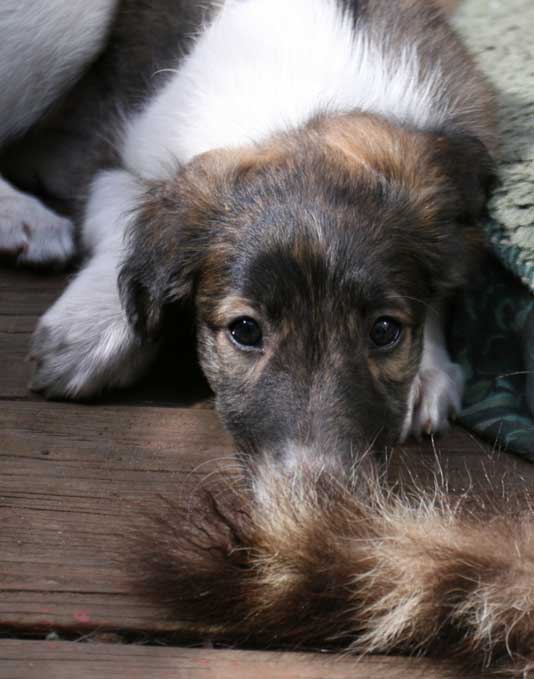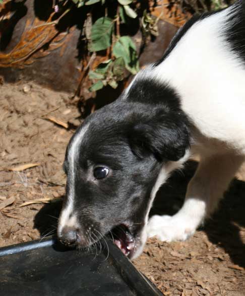 At six weeks, the Mythos babies are free roaming through the house and yard, and playing with everything in sight . Sazi is one of their favorite grown up pals.