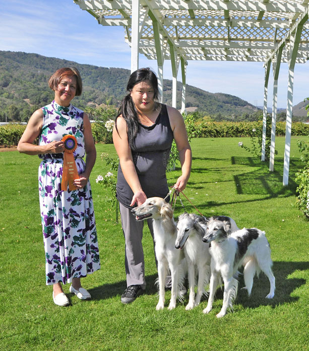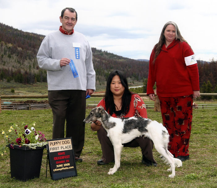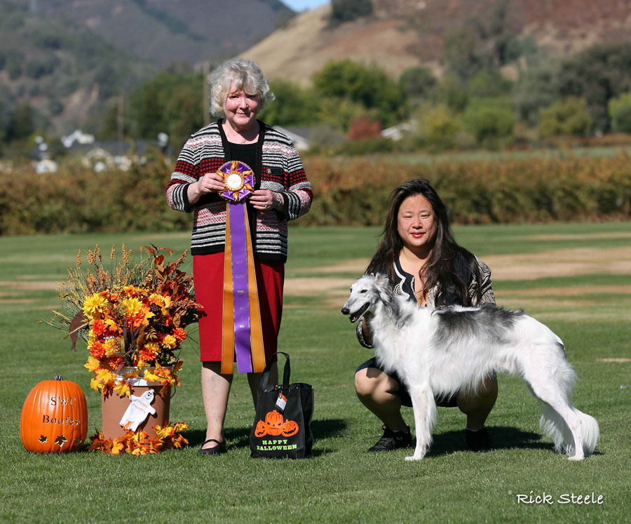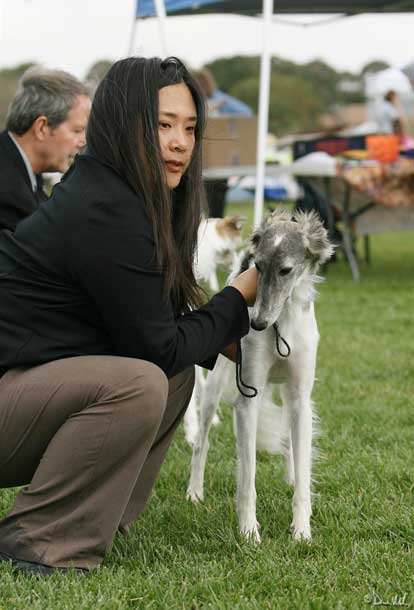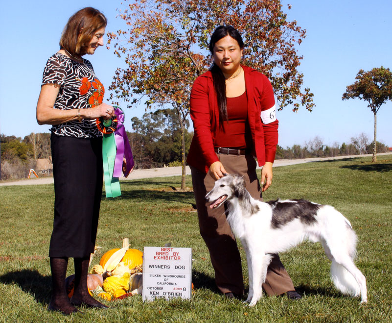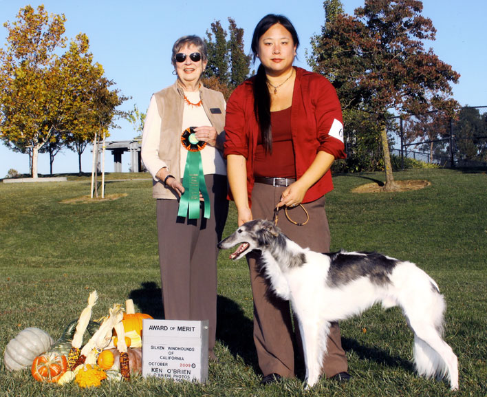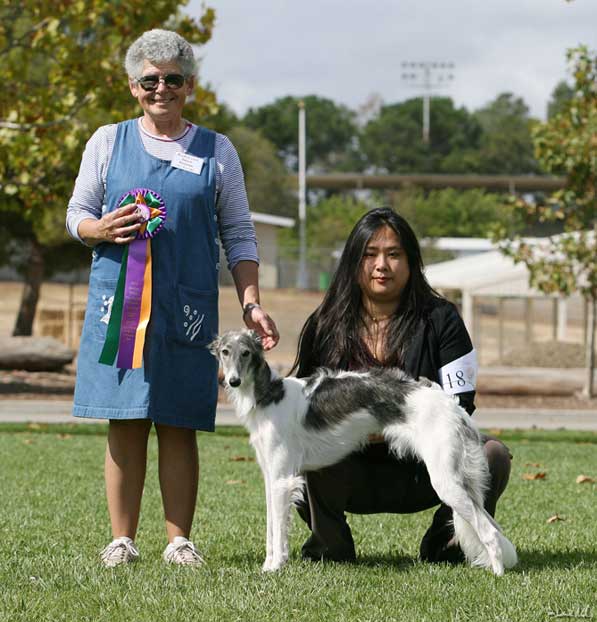 Dresden and me in the ring at the Silken Windhound Western Regional Specialty 2008 Dresden got his first 5 pt major at his next set of Rarities / NAKC shows in late September of 08, along with a smattering of other points, and in October of 08 , at our Silken Windhounds of California Regional Specialty, under judge Sally Barron of Barron's Borzoi, Dresden took Best Opposite Sex Puppy in Show!
