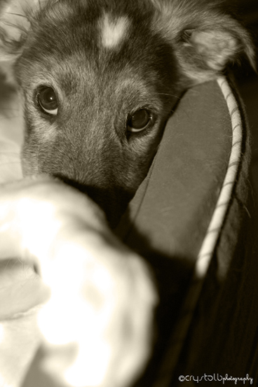 Dresden in August of 09 at the beach at Fort Funston His favorite hobby not involving socializing, is carefully dismantling something he's curious about, so we've had to rescue many objects from his scientific dissections . He's perfected the art of turning pencils into schrapnel, there have been some horrific book deaths, shoes were not safe, and we've survived a few unspeakable incidents with the remote controls. Luckily we're willing to wait through his childhood experimental period, and we're hoping his puppies don't share his penchent for scientific exploration.