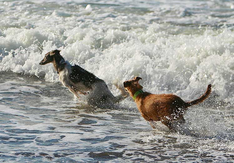 Dresden and Sophie the lurcher play in the waves Dresden's a wonderful dog who's had incredible pups, we're looking forward to many years of tummy rubs on the couch and movie watching and popcorn sharing with this happy boy!