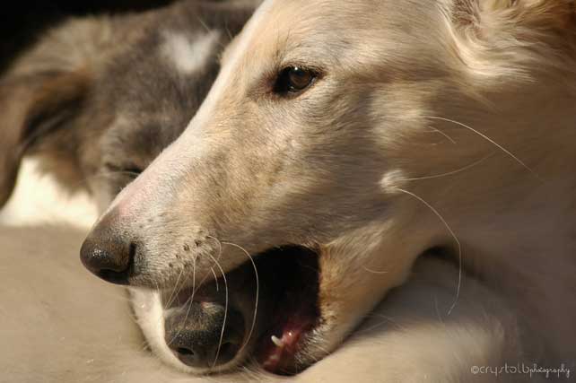 Dresden daydreaming in the ring at the Silken Windhound Western Regional Specialty 08 Dresden's equally welcoming to big and little dogs, and will get right down on the ground to gently play with toy dogs. When he was a young pup, he got to go to the small dog park frequently, and now he's sure all toy dogs are friends. Not all toy dogs appreciate this, but Dresden is convinced no toy dog can withstand his charm. He's politely and quietly persistant about getting other dogs to play, and is really wonderful with small, or shy and unsure dogs because of his considerate nature.
